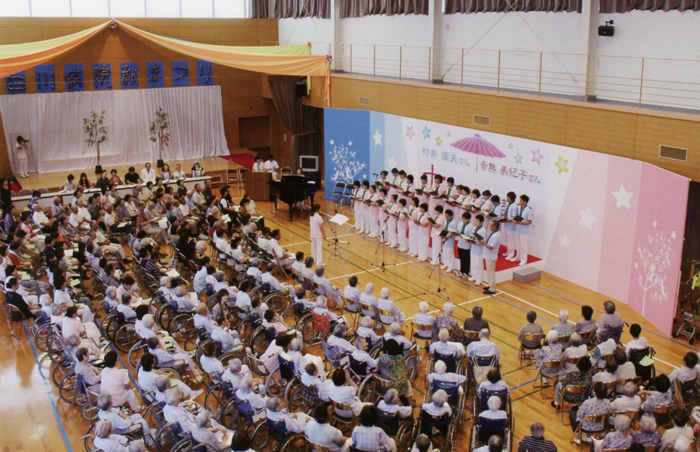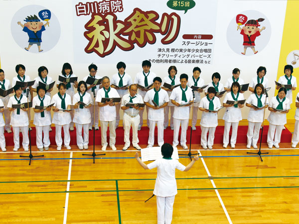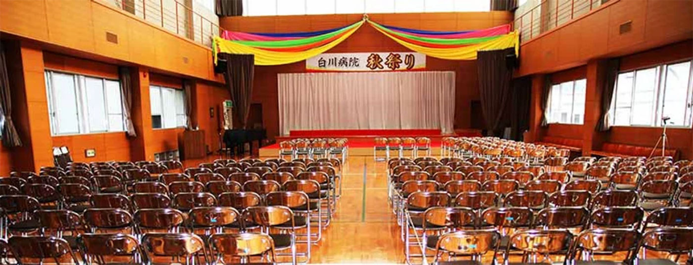 福利厚生 - 院内サークル - 陶芸 合唱 - 職員研修旅行 - 病院アリーナ 多目的ホールとして450人収容のアリーナがあります。音楽祭など患者さんや家族、地域の方とのふれあいの場として使用しています。白川病院職員のコーラスの練習場にもなっています。バレーボールやテニスも可能です。 北病棟3階 450人収容多目的ホール(アリーナ)