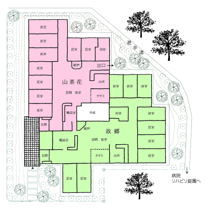 利用者様の満足・ご家族様の安心・地域の方々の信頼をモットーに、地域とのふれあいを大切にしながら、その人らしくゆったり楽しく笑顔で生活が送れるようお手伝いします。隣接地に病院がありますので、安心して医療も受けられます。